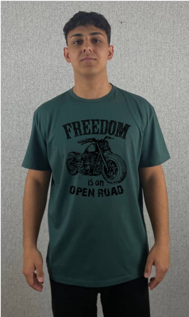 Футболка темно зелена пряма класична з принтом “Байк і свобода” 190гр/см2
